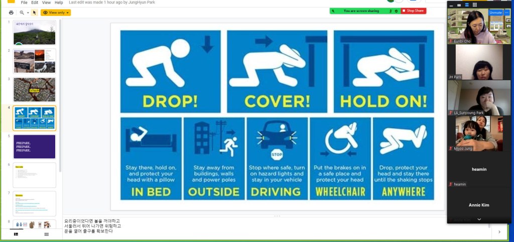 이날은 일본에서 수년간 직장생활을 해오셨던 NHN America 에서 프로젝트 매니저로 계시는 박정현님께서 엘에이의 지진을 대비할 수 있는 방법들을 공유해 주셨습니다.
