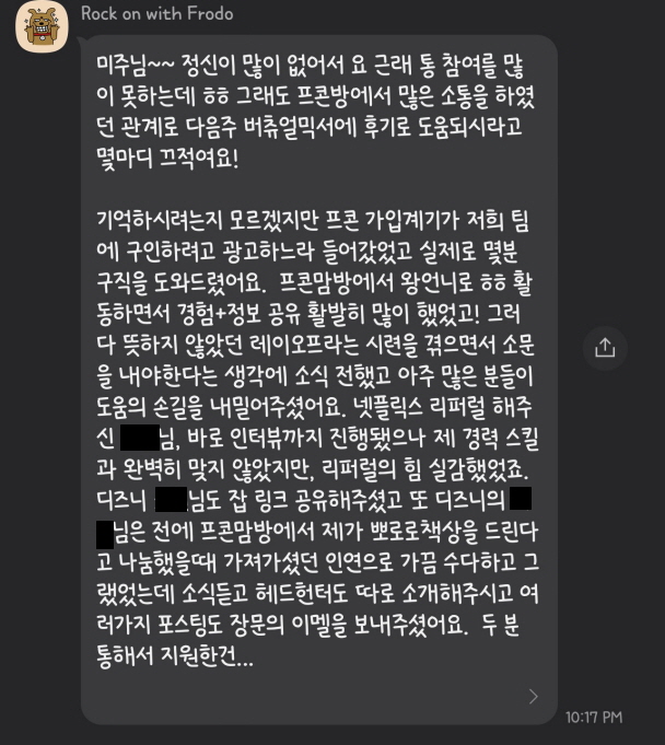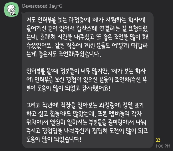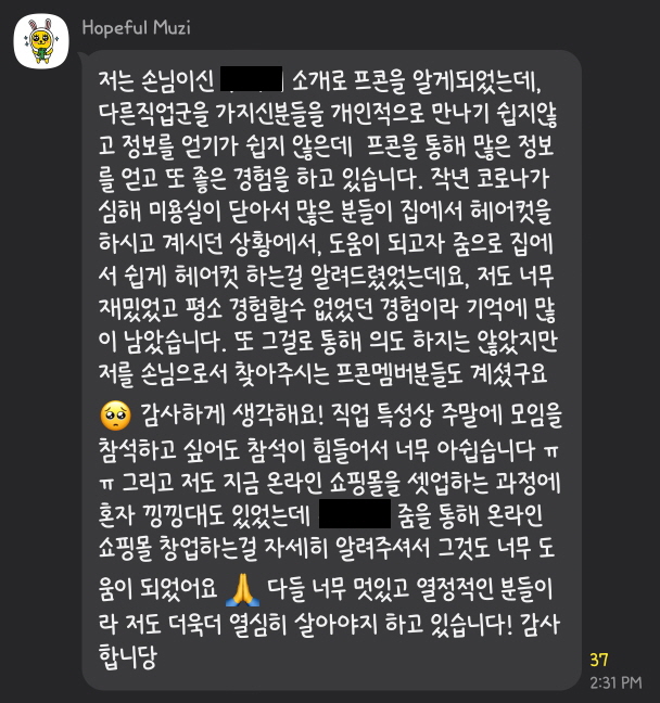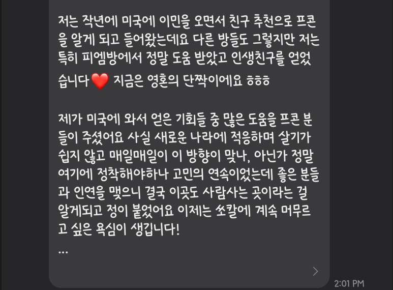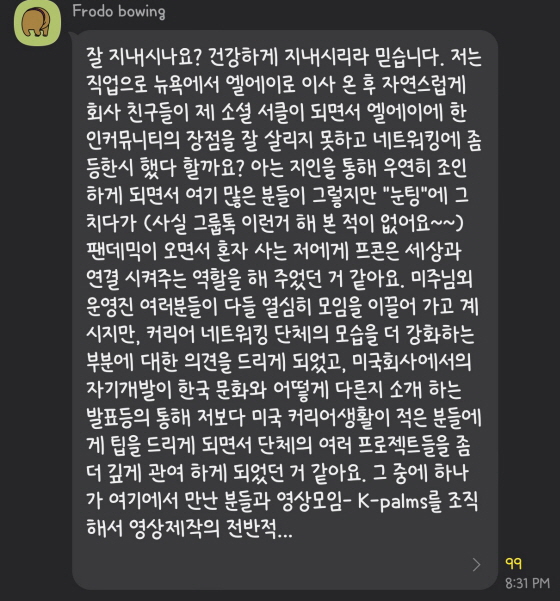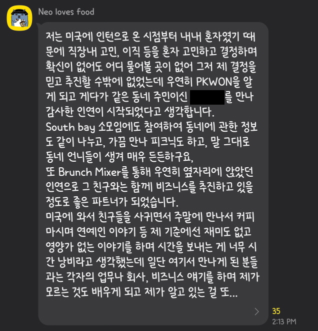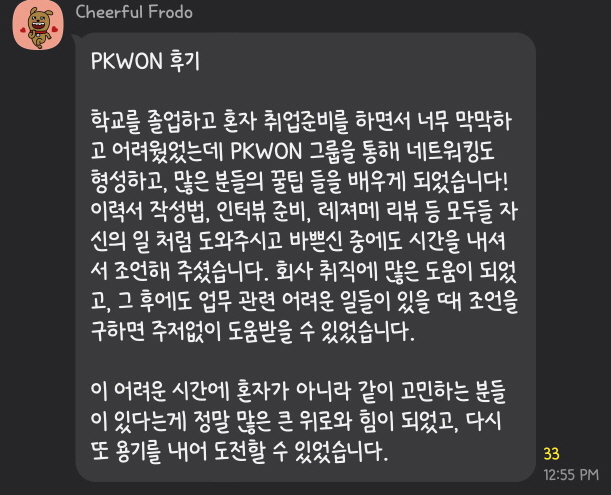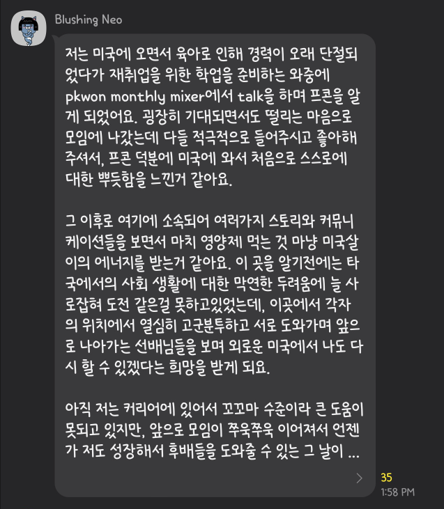 PKWON 그룹 회원분들에게 그룹에서 네트워킹을 하면서 얻은 도움, 좋은 경험들에 대해서 공유해 달라는 부탁을 드린 적이 있습니다. 아래는 회원님들이 카톡방에서 그 경험담을 공유해주신 내용입니다.