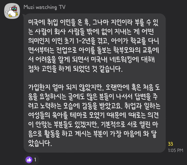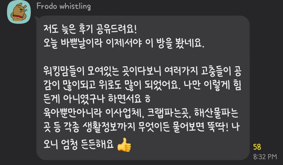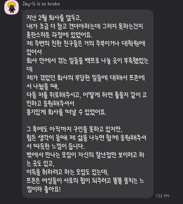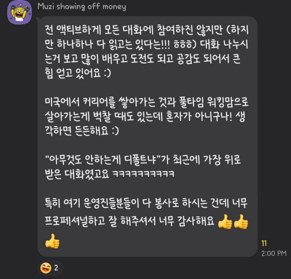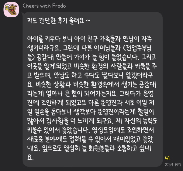 인생 친구를 만나게 되었다는 분부터, 리퍼럴을 받아 취업에 성공하신 분, 워킹맘으로써 고군분투하며 사느라 외롭고 힘들었는데 위로받고 격려받으신 분, 취업강좌에서 부터 생활정보까지 다양한 정보들로 도움받으신 분들까지 경험들이 매우 다양했고 커리어 뿐만 아니라 생활적인 면, 멘탈적인 면까지 두루 도움받고 계시는걸 알 수 있습니다.