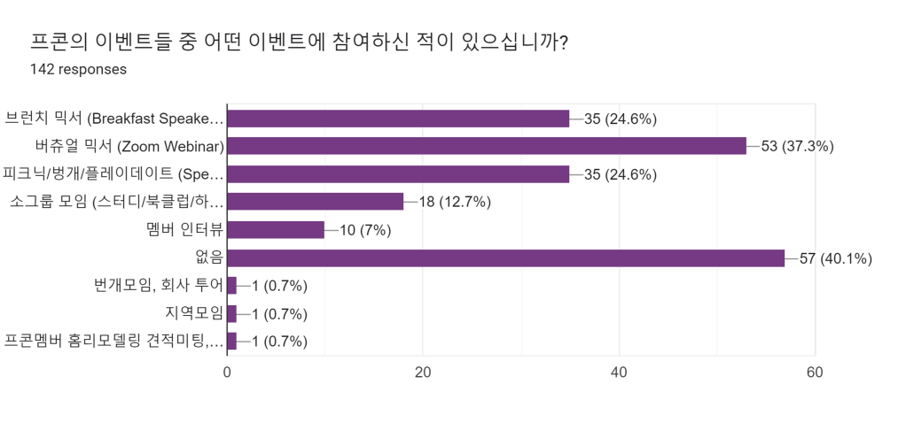 안타깝게도 ‘이벤트에 참여해본 적이 없음’이 40.1%로 가장 많은 퍼센테이지를 차지하였습니다. 그 다음으로는 버츄얼 믹서, 브런치 믹서가 뒤를 이었습니다.